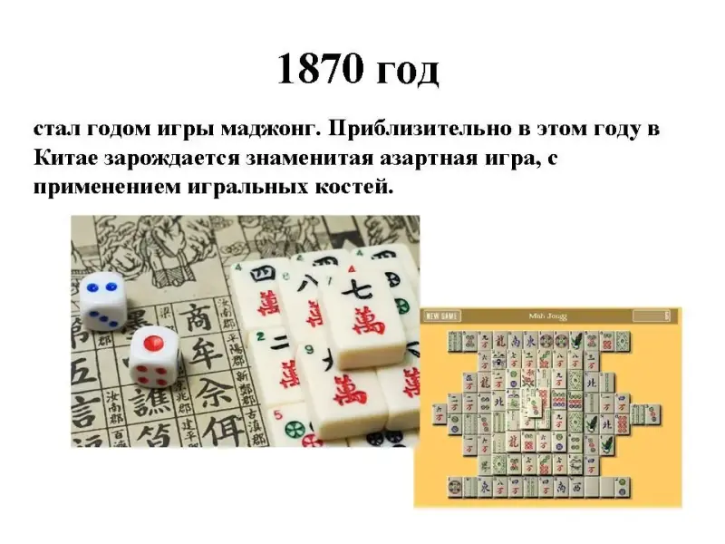 1870 год стал годом игры маджонг. Приблизительно в этом году в Китае зарождается знаменитая азартная игра, с применением игральных костей.