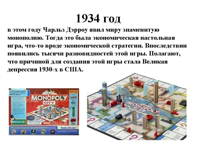 1934 год в этом году Чарльз Дэрроу явил миру знаменитую монополию. Тогда это была экономическая настольная игра, что-то вроде экономической стратегии. Впоследствии появились тысячи разновидностей этой игры. Полагают, что причиной для создания этой игры стала Великая депрессия 1930-х в США.