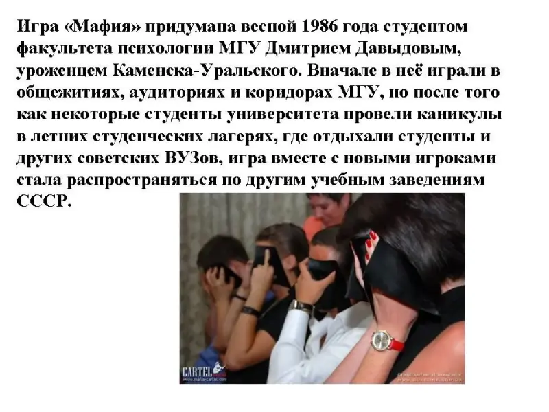 Игра "Мафия" придумана весной 1986 года студентом факультета психологии МГУ Дмитрием Давыдовым, уроженцем Каменска-Уральского. Вначале в неё играли в общежитиях, аудиториях и коридорах МГУ, но после того как некоторые студенты университета провели каникулы в летних студенческих лагерях, где отдыхали студенты и других советских ВУЗов, игра вместе с новыми игроками стала распространяться по другим учебным заведениям СССР.