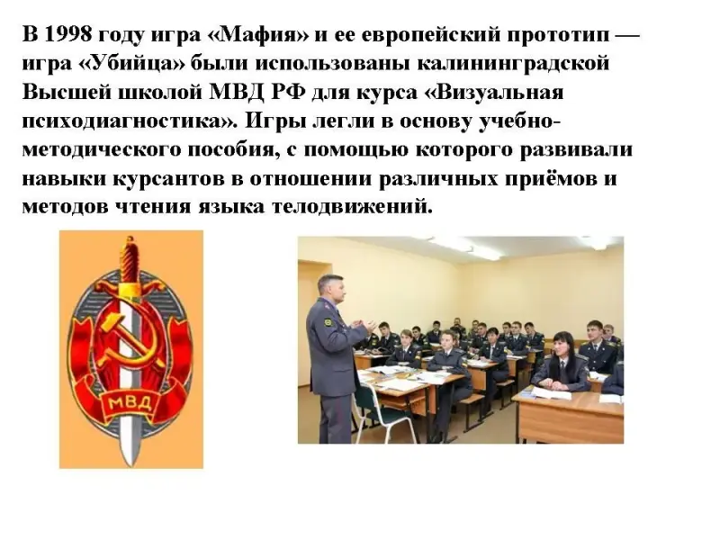 В 1998 году игра "Мафия" и ее европейский прототип - игра "Убийца" были использованы калининградской Высшей школой МВД РФ для курса "Визуальная психодиагностика". Игры легли в основу учебно-методического пособия, с помощью которого развивали навыки курсантов в отношении различных приёмов и методов чтения языка телодвижений.