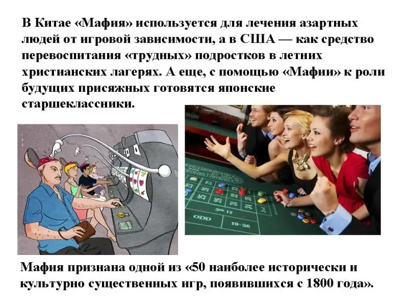В Китае "Мафия" используется для лечения азартных людей от игровой зависимости, а в США - как средство перевоспитания "трудных" подростков в летних христианских лагерях. А еще, с помощью "Мафии" к роли будущих присяжных готовятся японские старшеклассники.