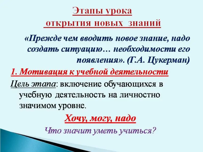 - осознание недостаточности имеющихся знаний (учитель способствует возникновению на уроке проблемной ситуации, в ходе анализа которой учащиеся понимают, что имеющихся знаний для ее решения недостаточно);