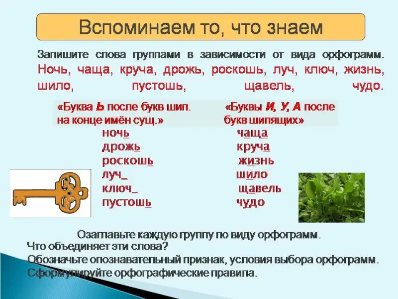 ( слайд 1) 1. - Запишите слова группами в зависимости от орфограммы (слова представлены на слайде с помощью компьютера): Ночь, чаща, круча, дрожь, роскошь, луч, ключ, жизнь, шило, пустошь, щавель, чудо. Слова должны быть записаны в два столбика с орфограммой «Буква Ьпосле букв шипящих в конце имён существительных» и «Буквы И, У, А после букв шипящих». (Это материал, изученный в начальных классах.) 2. Проверка проводится с помощью следующего слайда: