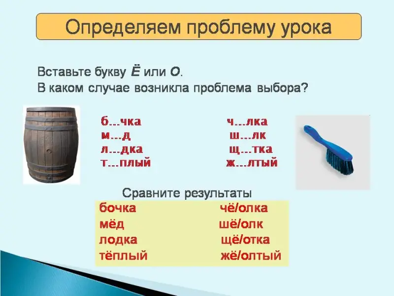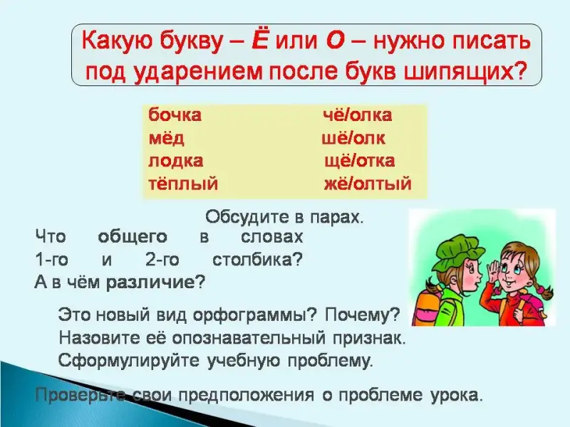 Ученики читают материал и выполняют задания под рубрикой «Определяем основной вопрос урока». (Этот материал представлен в презентации, в этом случае работа проводится при закрытых учебниках.) При подходе к проблеме важно зафиксировать ещё раз опознавательный признак орфограммы - наличие буквы шипящего, а также новый вид орфограммы, так как есть возможность выбора буквы гласного О или Ё под ударением. Это и служит основой постановки проблемного вопроса: какую букву - О или Ё - нужно писать под ударением после буквы шипящего? Проблемный вопрос можно записать на доске, а после этого сравнить с формулировкой в учебнике. |