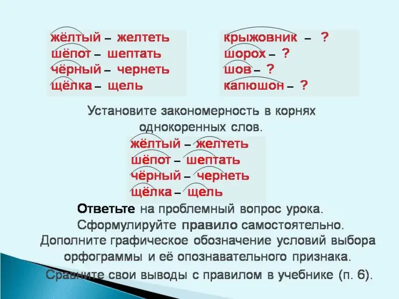 2. Далее учащиеся самостоятельно (можно в парах) подбирают и записывают в тетрадях однокоренные слова, устанавливают закономерность замены буквы Ё на Е в корнях однокоренных слов: жёлтый - желтеть, шёпот - шептать, чёрный - чернеть и существительные щёлка - щель. Затем устанавливают невозможность подобной замены при подборе однокоренных слов во 2м столбике, делают вывод о написании буквы Ё или Опосле букв шипящих в корне и сравнивают с формулировкой в учебнике. Отдельно проводится работа с графическими моделями орфограммы. |