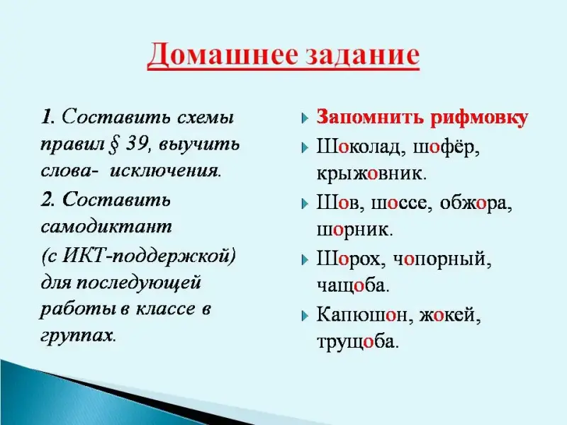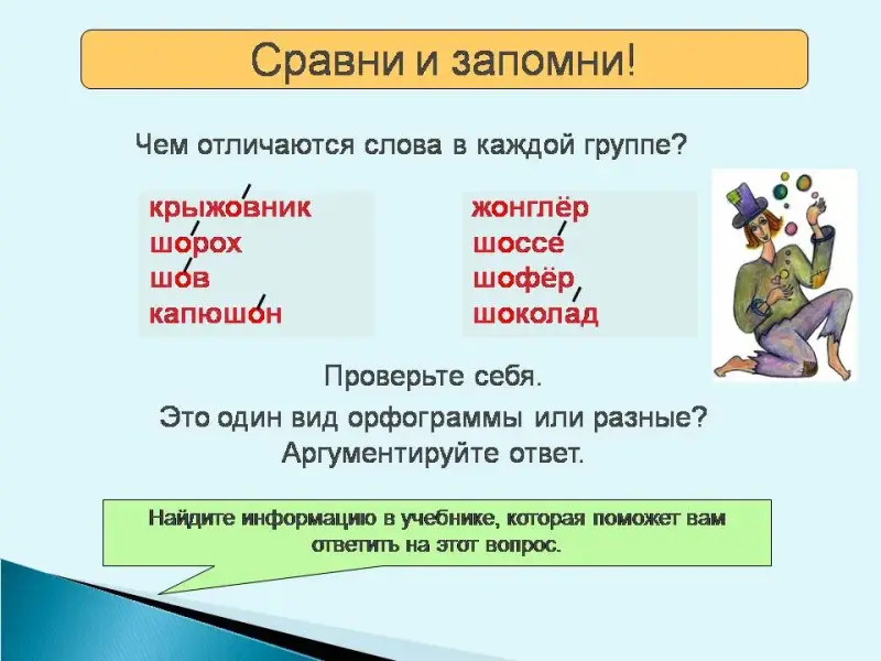 - Подберите и сгруппируйте примеры так, чтобы они отражали ключевые слова урока. 1) шёлк, шов (искл.); 2) ожог (сущ.), ожёг (гл.); 3) шоссе, жонглёр. |
