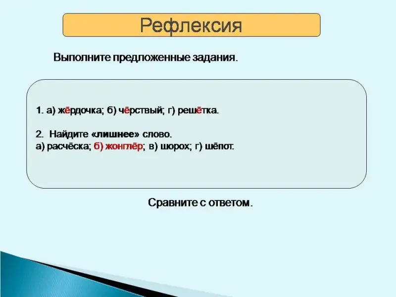 - Что объединяет эти слова? (Общий опознавательный признак орфограмм - наличие буквы шипящего.) - Обозначьте в словах этот опознавательный признак. - Назовите условия выбора орфограмм. - На основе графических обозначений сформулируйте правила. 3. - Назовите слово, при произнесении которого нужно знать орфоэпическую норму. (Щавель.) - С какой особенностью произношения связана эта норма? (С ударением.) - Опираясь на подобранный дома материал, проведите самопроверку домашнего задания. Несколько человек записывают на доске по 3-4 слова из своих личных орфоэпических минисловариков, не делая никаких дополнительных обозначений (это слова, в которых возможны ошибки в произношении или ударении). Остальные учащиеся читают их вслух, при необходимости объясняются орфоэпические особенности данных слов. |