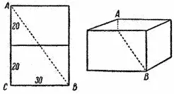 Кратчайший путь легко определится, если мы мысленно повернем верхнюю грань камня так, чтобы она оказалась в одной плоскости с передней (рис. 317). Тогда станет очевидным, что кратчайший путь-прямая линия, соединяющая А и В. Какова длина этого пути? Мы имеем прямоугольный треугольник ABC, в котором АС = 40 см, СВ = 30 см. По Пифагору, третья сторона, АВ, должна равняться 50 см, потому что 302 + 402 = 502.