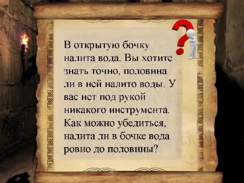 - В открытую бочку налита вода, на взгляд как будто до половины. Но вы хотите знать точно, половина ли в ней налита, больше половины или меньше половины. У вас нет под рукой ни палки, ни вообще какого бы то ни было инструмента для обмера бочки.