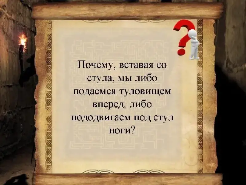 - Почему, вставая со стула, мы либо подаемся туловищем вперед, либо пододвигаем под стул ноги? (Вставая, мы подаемся туловищем вперед, перемещая этим центр тяжести, а пододвигаем ноги назад для того, чтобы подвести опору под центр тяжести).