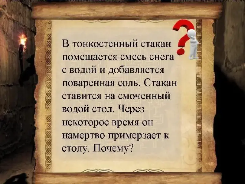 - В тонкостенный стакан помещается смесь снега с водой и добавляется поваренная соль. Стакан ставится на смоченный водой стол. Через некоторое время он намертво примерзает к столу. Почему? (Растворение соли сопровождается поглощением энергии. Смесь охлаждается. Вода под стаканом замерзает.)