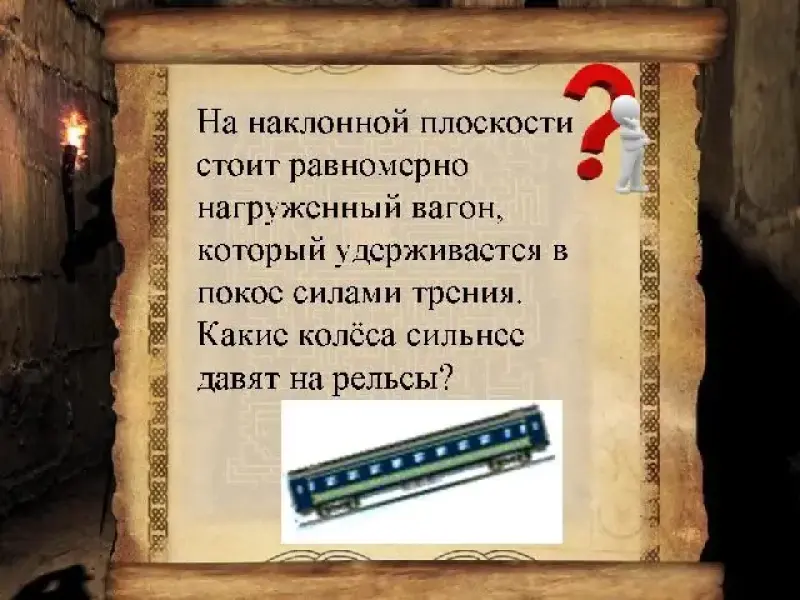- На наклонной плоскости стоит равномерно нагруженный вагон, который удерживается в покое силами трения. Какие колёса сильнее давят на рельсы? (ОтветДавление будет чуть больше