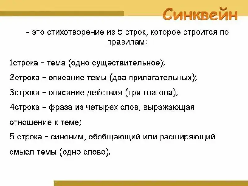 - 5 строка - синоним, обобщающий или расширяющий смысл темы (одно слово).