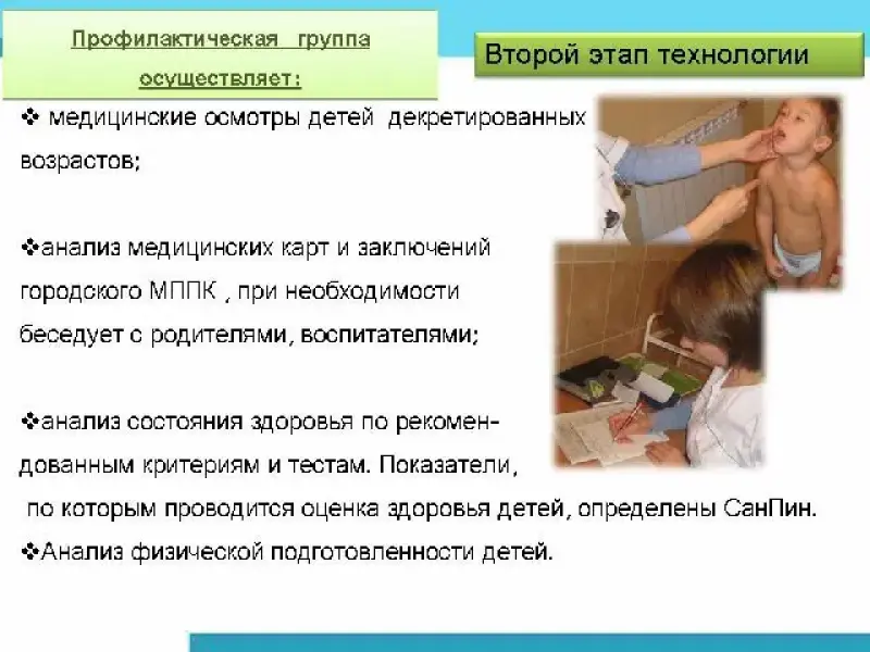 Профилактическая группа осуществляет: медицинские осмотры детей декретированных возрастов (перед поступлением в детский сад, за год до поступления в школу, перед поступлением в школу) включающие доврачебный (на основе программы скрининг - тестов), педиатрический и специализированный этапы.