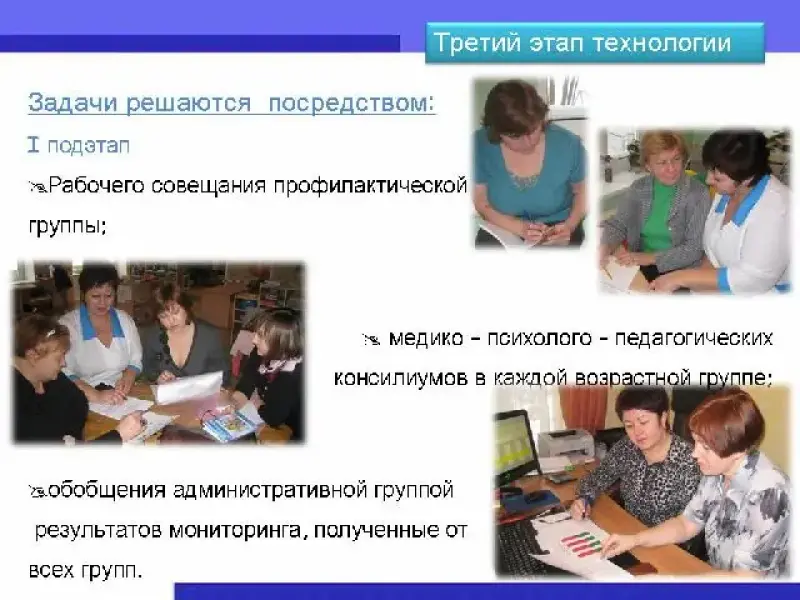 - Рабочего совещания профилактической группы, в процессе которого результаты и ход проведенного обследования оформляются презентативно. Вырабатываются рекомендации для коррекции выявленных проблем.