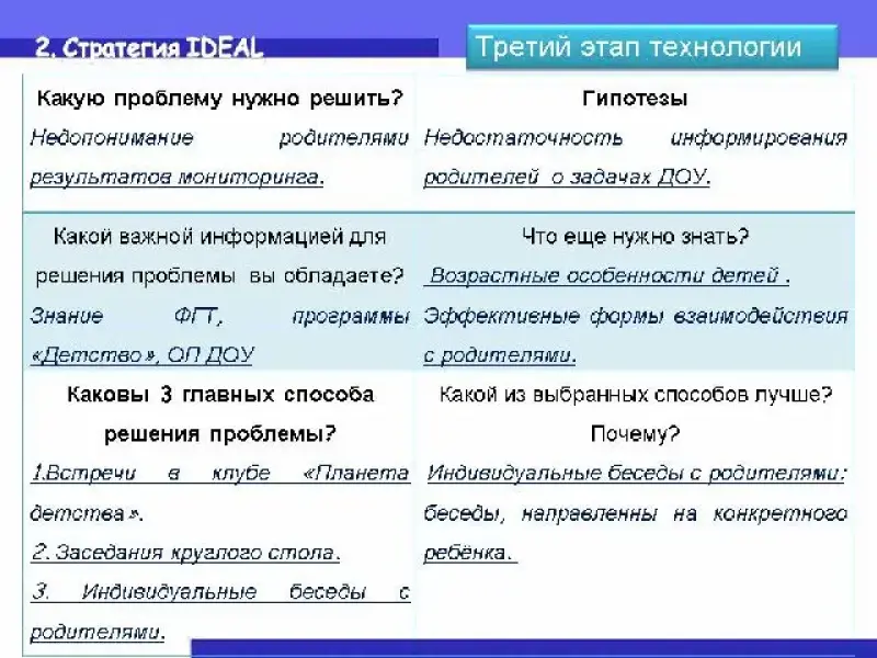 2. Стратегия IDEAL позволяет увидеть проблему, проанализировать ее, выделить аспекты, оценить и выбрать способы решения. (Слайд 19).