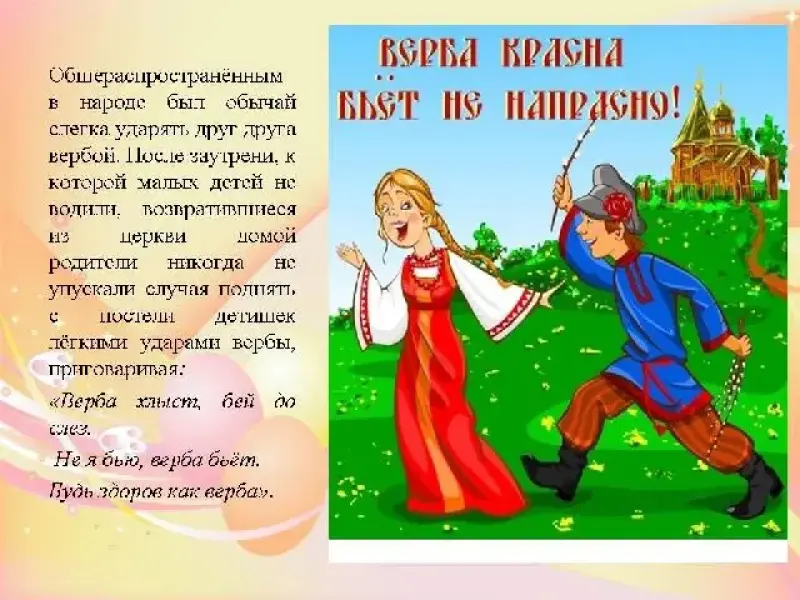 Общераспространённым в народе был обычай слегка ударять друг друга вербой. После заутрени, к которой малых детей не водили, возвратившиеся из церкви домой родители никогда не упускали случая поднять с постели детишек лёгкими ударами вербы, приговаривая: