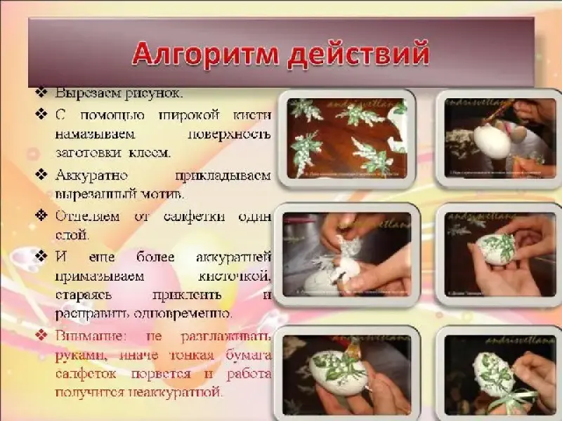 - Для учащихся - бумага для квиллинга, акриловые краски, кисти, клей ПВА, салфетки для декупажа, яичная скорлупа.