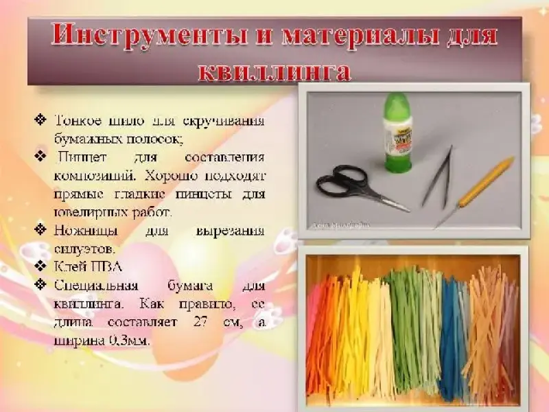 Для работы нам понадобятся:полоски 0,5 х 30 мм цветной бумаги, клей ПВА и кисточка для клея, зубочистки.(Слайд 27)