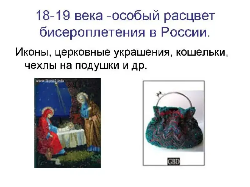 В 9 в. появился бисер и на Руси. А 18-19 вв. - особый расцвет бисероплетения в России. Умельцы из бисера изготавливали церковные украшения, кошельки, чехлы для подушек, чернильниц. Бисером вышивали платья, целые картины, иконы. (Презентация: слайд 3).