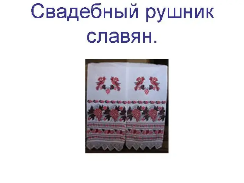 У славян на свадебном рушнике по традиции вышивалась виноградная лоза, её вышивали со стороны жениха. В древности виноград был символом богатства, которое должно сопровождать по жизни мужчину и его семью. (Презентация: слайды 6, 7)