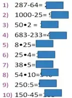| 6) 25*4=? | 7) 38 * 11=? | 8) 54 * 11=? | 9) 250: 5=? | 10)150- 45 = ? |