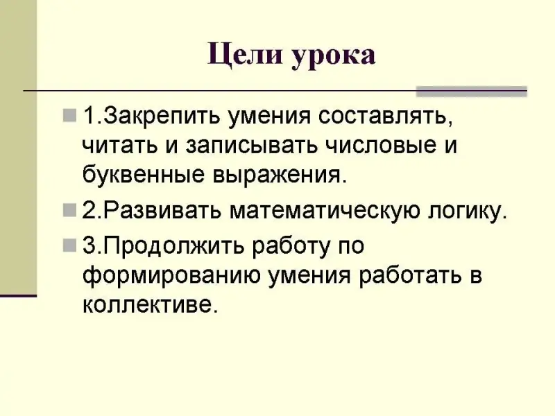 - Закрепить навыки чтения и записи числовых и буквенных выражений;