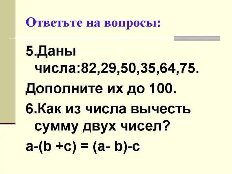 7) Даны числа: 82, 29, 50, 35, 64, 75. Дополнить их до 100.