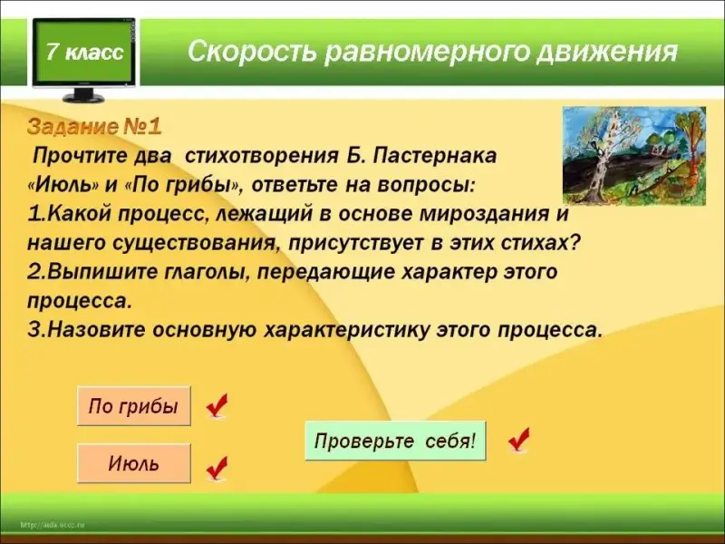 Предлагаю учащимся прочесть два стихотворения Б. Пастернака: "Июль" и "По грибы", ответить на вопросы: 1. Какой процесс, лежащий в основе мироздания и нашего существования, присутствует в этих стихах? 2. Выпишите глаголы, передающие характер этого процесса. 3. Назовите основную характеристику этого процесса. |