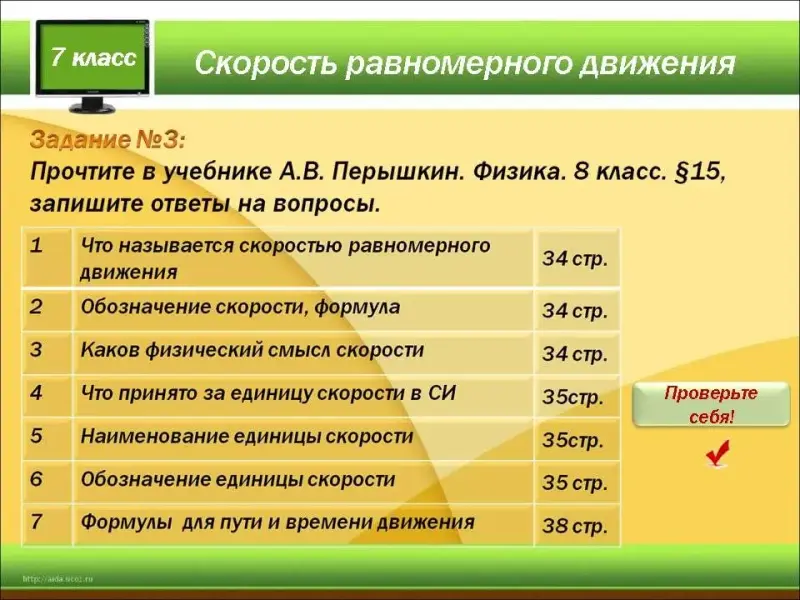 1.Предлагаю описать скорость равномерного движения, используя учебник и карточку-предписание с обобщенным планом изучения физической величины. | 1. Письменно отвечают на вопросы карточки-предписания, работая с учебником. Составляют краткий конспект по плану: