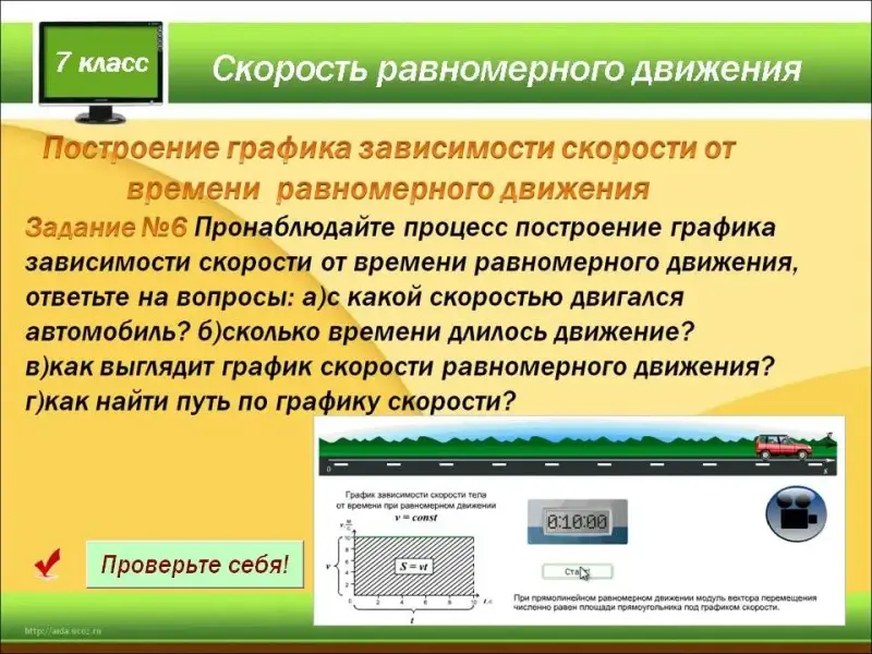 а)с какой скоростью двигался автомобиль? б)сколько времени длилось движение? в)как выглядит график скорости равномерного движения? г)как найти путь по графику скорости? |