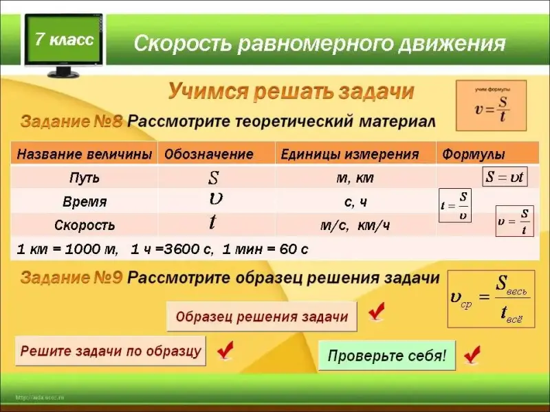 а)определение скорости б)обозначение в)уравнение г)единицы скорости д)направление скорости |