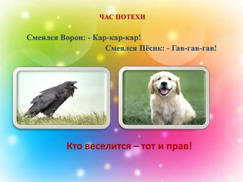| Слайды 6-11 | 2-й пункт плана.Учитель предлагает подготовленным ученикам читать веселые стихи, всем остальным повторять за ними, стараясь достовернее подражать голосам животных. Выступление сопровождается показом слайдов. | Групповая и фронтальная работа. Дети вначале прослушают выступление группы товарищей, затем с открытого учителем слайда презентации весело по цепочке прочитывают текст с подражательной интонацией. | ||