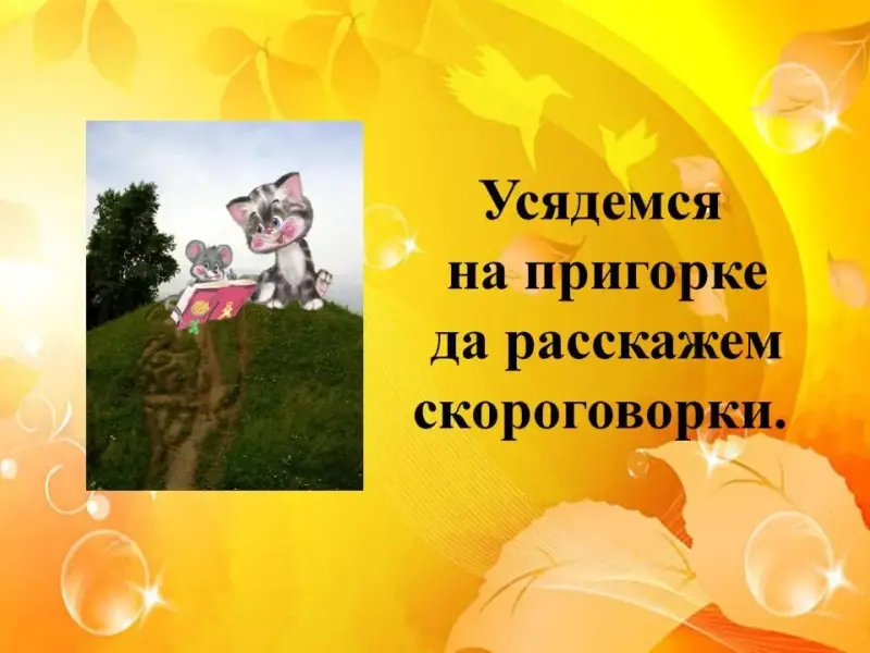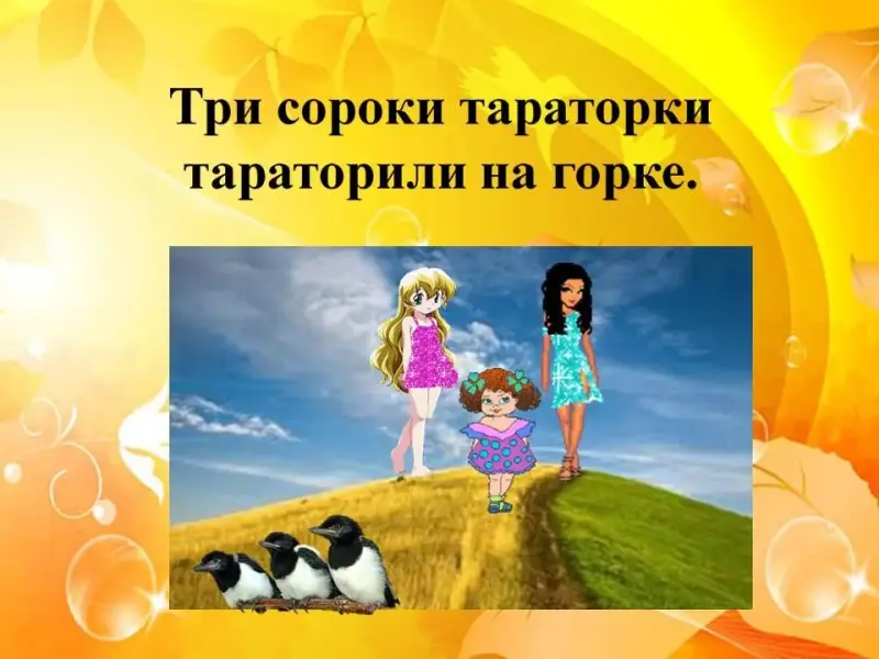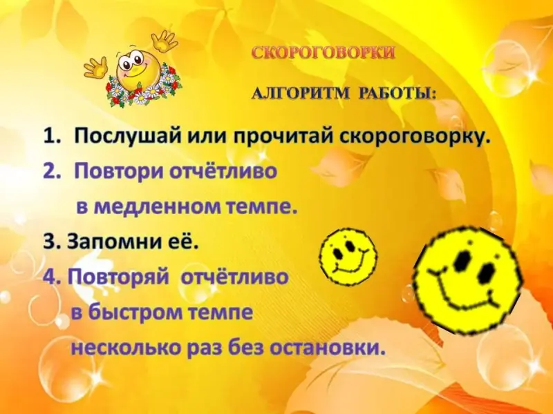 | Слайды 12-22 | 3-й пункт плана. Работа со скороговорками по предложенному алгоритму. | Дети вначале коллективно учатся правильно произносить текст скороговорки, затем упражняются в быстром и чётком произношении з раза подряд, работая в парах. | ||