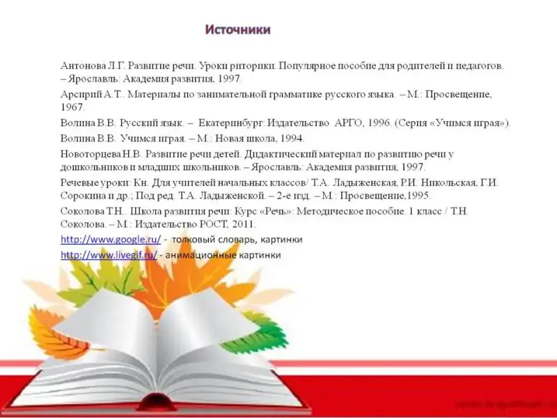 - Антонова Л.Г. Развитие речи. Уроки риторики. Популярное пособие для родителей и педагогов. - Ярославль: Академия развития, 1997.