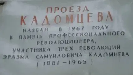В 1967-м, в год 50-летия Октябрьской революции, решили назвать зеленый проезд от акведука до железной дороги именем Э.С.Кадомцева. Уже 45 лет этот проезд носит имя Э. Кадомцева.