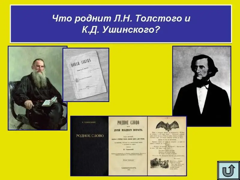 Что роднит Л.Н. Толстого и К.Д. Ушинского? (Педагоги, любили и понимали детей, стремились дать каждому ребенку образование, авторы-составители учебников...)