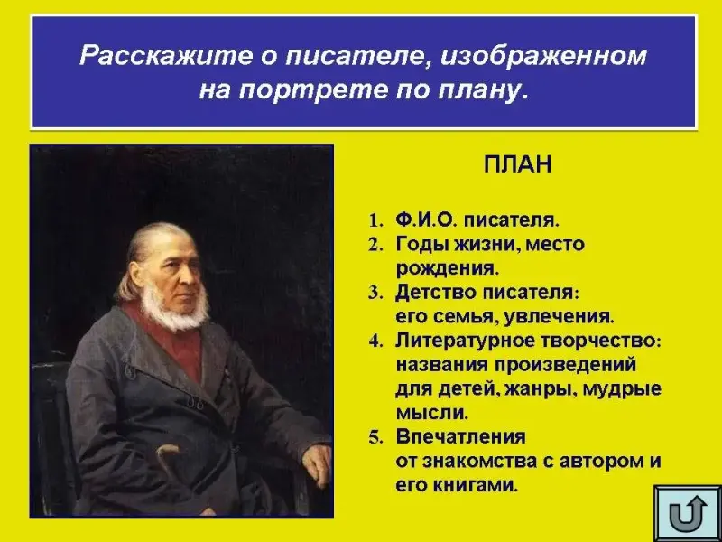 Расскажите о писателе, изображенном на портрете по плану. (С. Аксаков)