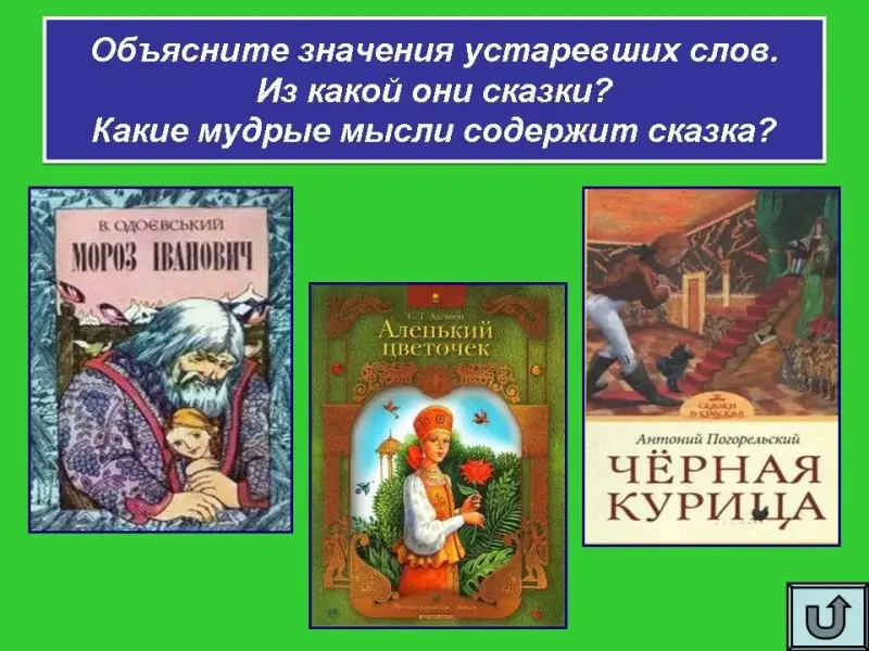 Объясните значения устаревших слов. Из какой они сказки? Какие мудрые мысли содержит сказка?