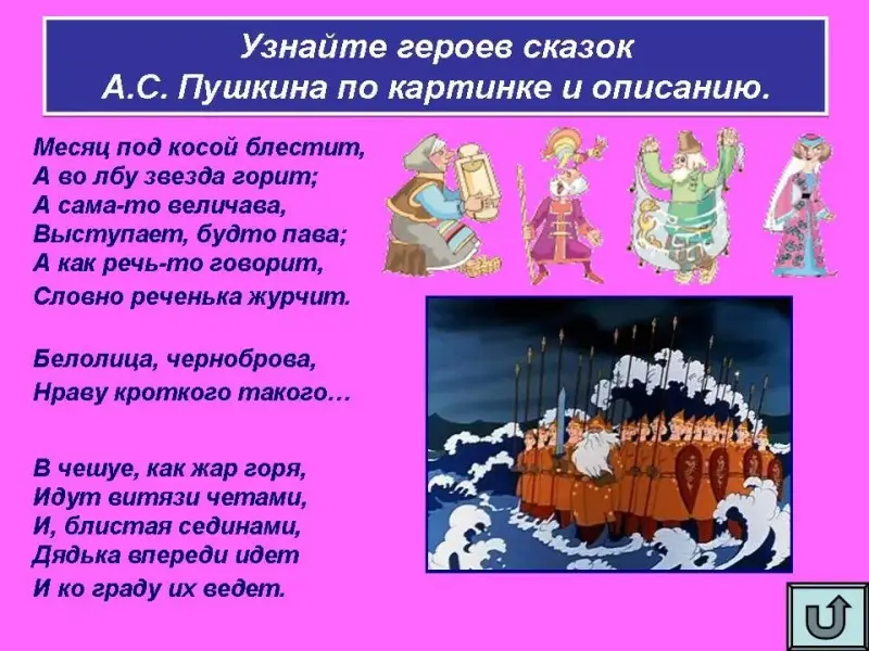 Узнайте героев сказок А.С. Пушкина по картинке и описанию.