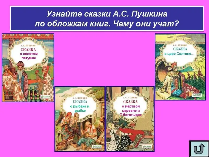 Узнайте сказки А.С. Пушкина по обложкам книг. Чему они учат?
