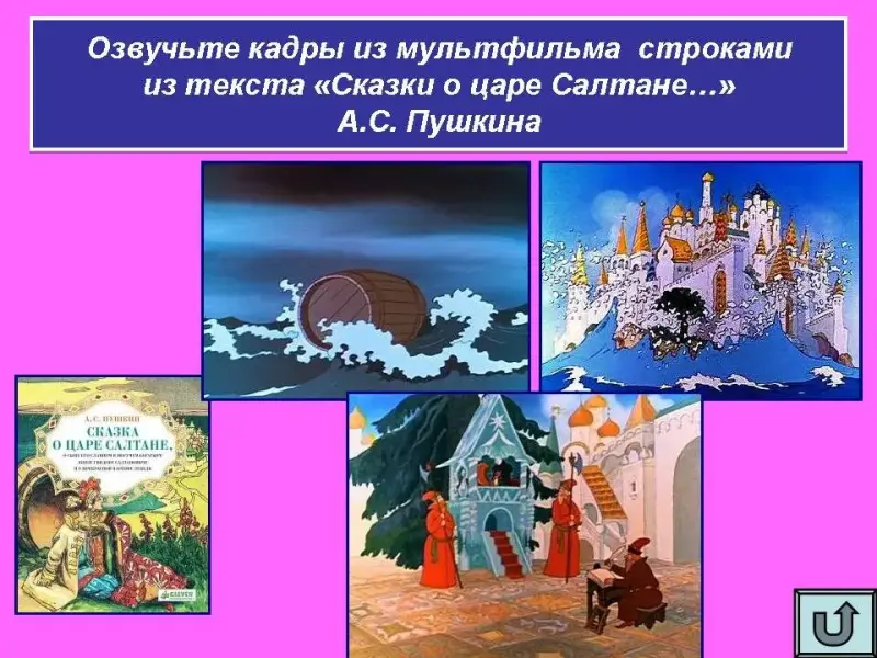 Озвучьте кадры из мультфильма строками из текста "Сказки о царе Салтане..." А.С. Пушкина.