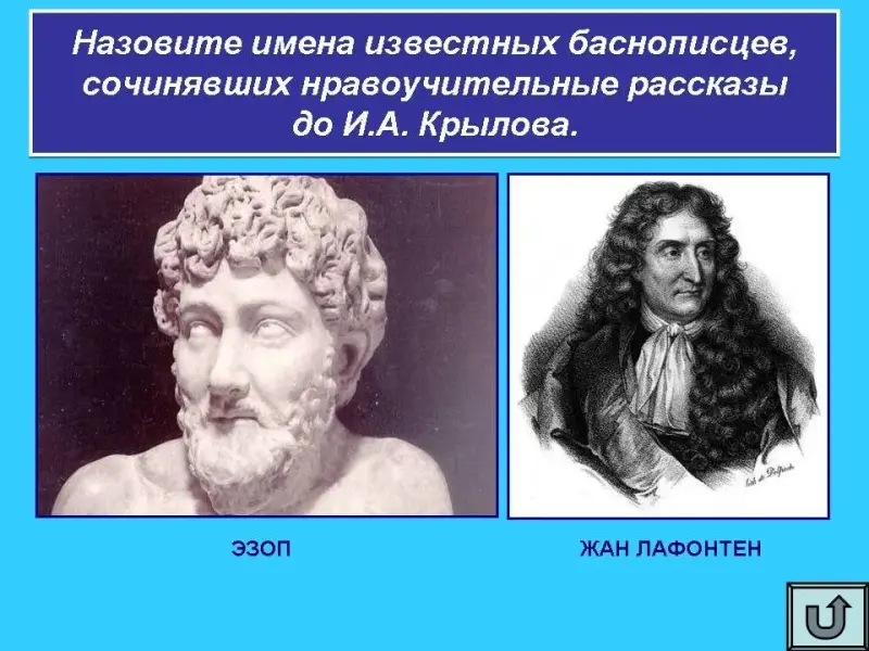 Назовите имена известных баснописцев, сочинявших нравоучительные рассказы до И.А. Крылова. (Эзоп, Лафонтен)