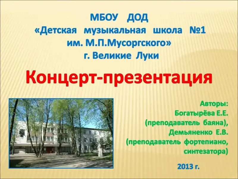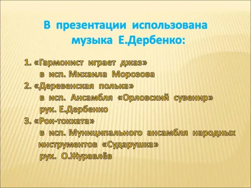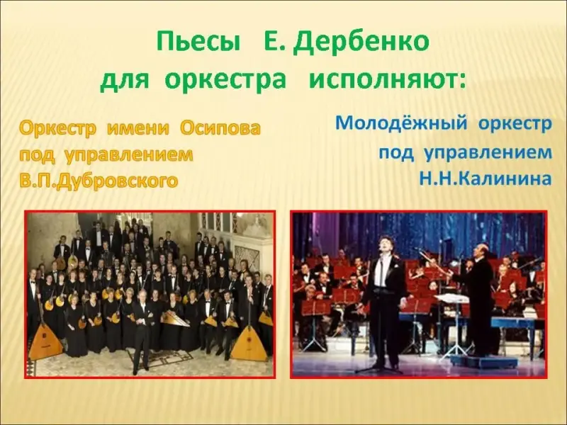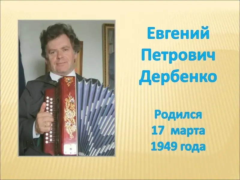 Слайды 1-2. Дорогие друзья! Наша концертная программа посвящена творчеству популярного российского композитора, работающего в жанре музыки для русских народных инструментов, Евгению Петровичу Дербенко. Сегодня, наверное, нет ни одного баяниста, который бы не знал его обработок народных мелодий или оригинальных сочинений. Интересна музыка этого автора и для других инструментов и ансамблей. А познакомят нас с ней учащиеся класса баяна преподавателя Богатырёвой Елены Евгеньевны и учащиеся класса фортепиано и синтезатора преподавателя Демьяненко Елены Валерьевны.