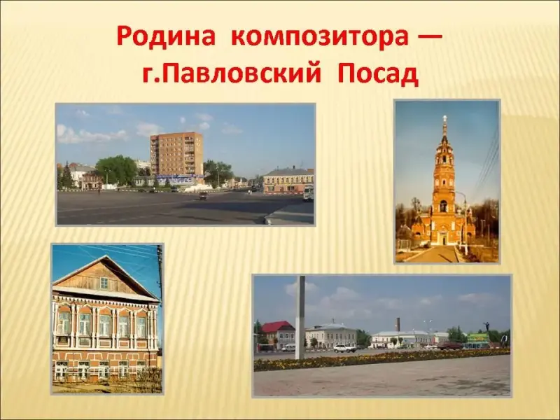 Слайд 3. Родина композитора - подмосковный город Павловский Посад. Первым музыкальным впечатлением детства, определившим дальнейшую судьбу Евгения Дербенко, была поразившая его воображение игра на гармони соседа-самоучки. Сам Евгений начал сочинять музыку в первом классе музыкальной школы. Строгий учитель по классу баяна, услышав его первый вальс, произнёс: "Ну что ж, ничего гениального". Начинающий автор, конечно, расстроился, но занятия сочинительством не бросил, хотя учителю свои опусы больше не показывал.
