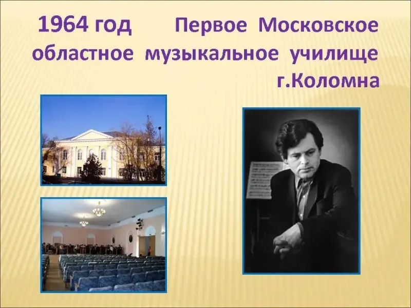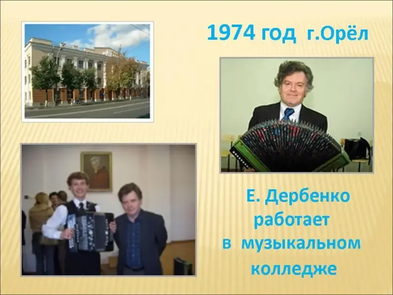 Слайд 4. В 1964 году Евгений Дербенко поступил в Первое Московское областное музыкальное училище в городе Коломне. Учился молодой Евгений по классу баяна, но увлечение сочинением музыки постепенно превращалось для него в жизненную необходимость. Так, заканчивая училище, на госэкзамене, он играл свою пятичастную Сонату для баяна.