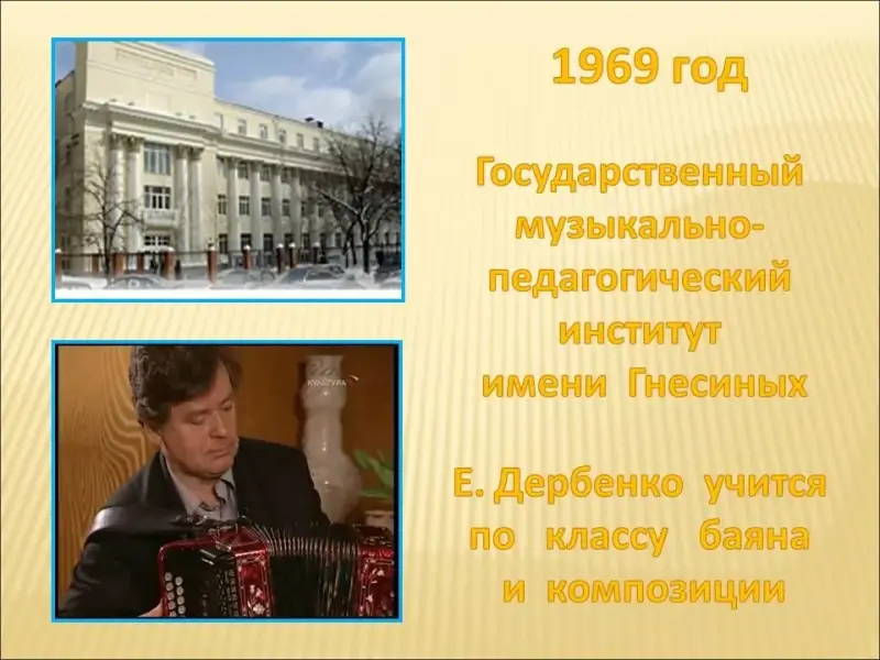 Слайд 5. Услышав произведение юного маэстро, экзаменационная комиссия дала Дербенко рекомендацию для поступления в Государственный музыкально-педагогический институт имени Гнесиных. В институте Евгений учился по классу баяна и по композиции.