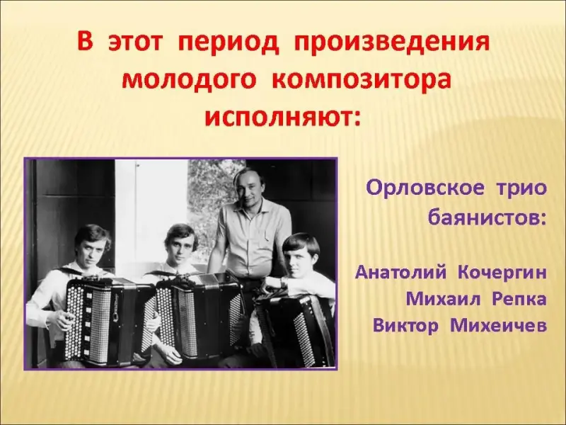 Слайд 8. В этот период произведения молодого композитора исполняет много различных коллективов: Орловское трио баянистов,