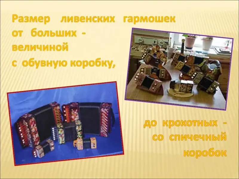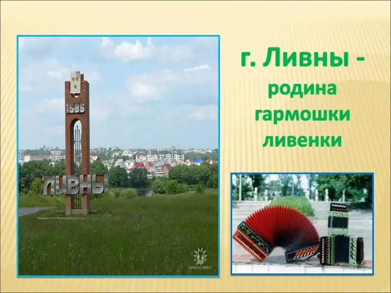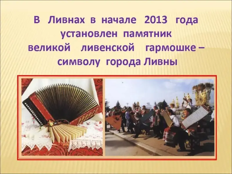Слайд 11. Сотни видов гармоник - саратовские, архангельские, осетинские, в каждой области своя. А звонкоголосые, одни из наиболее известных, ливенки делают в единственной на всю страну мастерской в орловском районном городе Ливны. Запели ливенки еще в конце XVIII века.