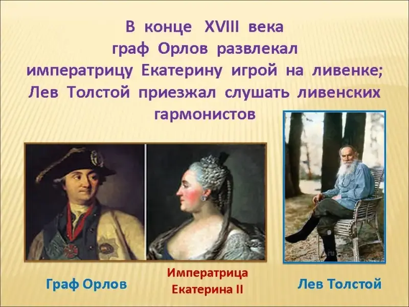 Слайд 12. Известно, что сам блистательный граф Орлов развлекал императрицу Екатерину игрой на гармошке. Приезжал в Ливны слушать ярмарочных гармонистов Лев Толстой. Ливенка была постоянной спутницей в радостях и бедах простого люда: и свадьбы, и похороны, и праздники нельзя было представить без неё.
